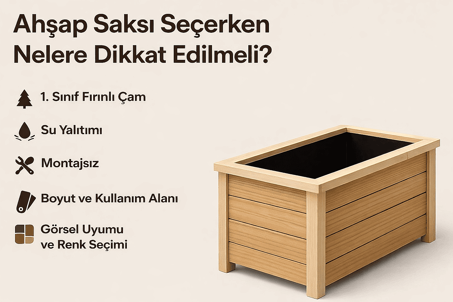 Kaliteli ahşap, saksının ömrünü belirler. Evmodo saksılarında kullanılan 1. sınıf fırınlı çam ağacı, hem dayanıklılığı hem de zarif dokusuyla öne çıkar. Çam ağacı dış mekâna uygunluğu ve hafifliği ile idealdir.